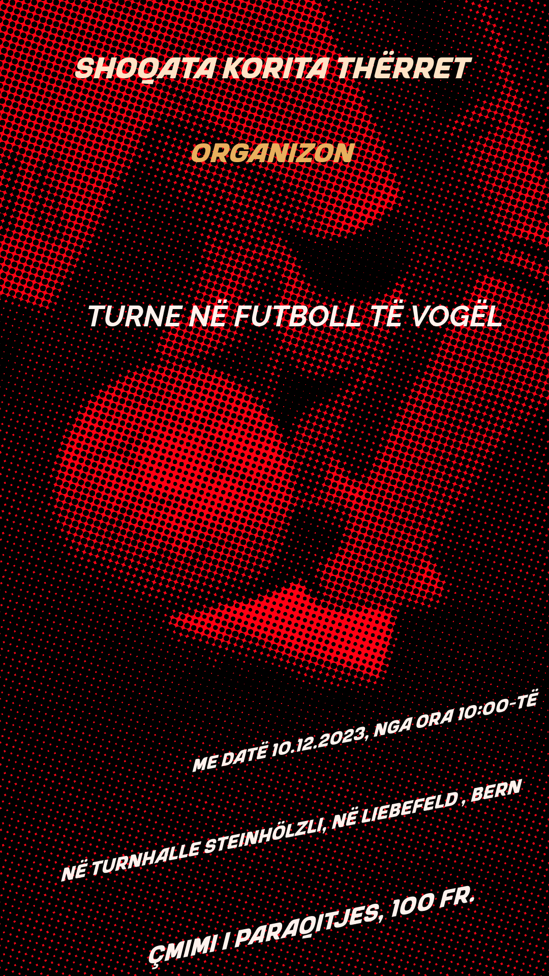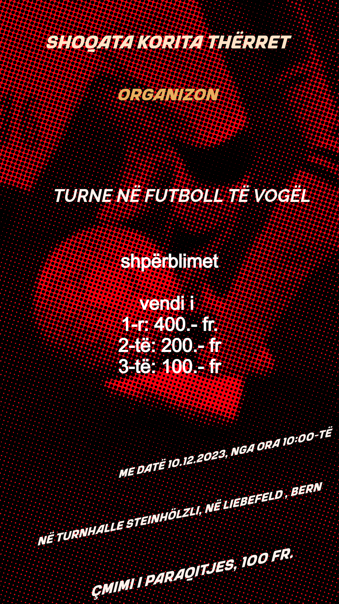 Shoqata Korita Thërret, ORGANIZON Turne në Futboll të vogël Të nderuar koritas në Zvicër, Të nderuar dashamirë të futbollit, Ju ftojmë të merrni pjesë në turneun e parë në futboll të vogël, që organizohet nga Shoqata Korita Thërret në Zvicër. Turneu do të mbahet me datë 10.12.2023, në Turnhalle Steinhölzli,…