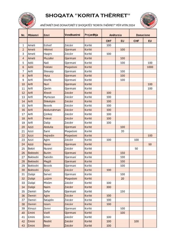 Shoqata “Korita Thërret” njofton me kënaqësi publikimin e listës së anëtarëve-donatorëve për vitin 2024